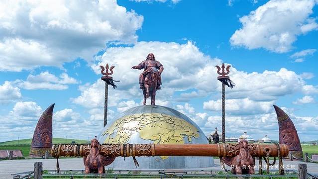 走进天下草原的景区大门,就可以看到成吉思汗的雕像和一根仿制的马鞭,长达19米,其所制造使用的红木是从 俄罗斯 进口,边上雕刻图案精美,手法细腻,可以说是一件艺术品。