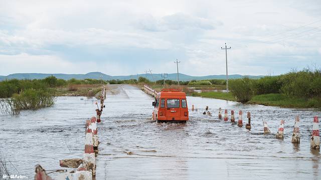 从我们住的陈巴尔虎旗出城几公里,草原上全是湿地,大家开心在公路上压着水花。