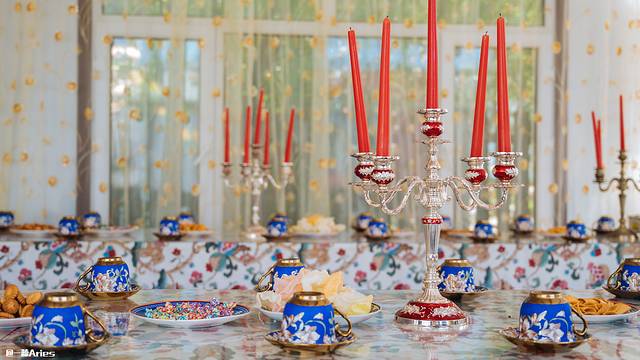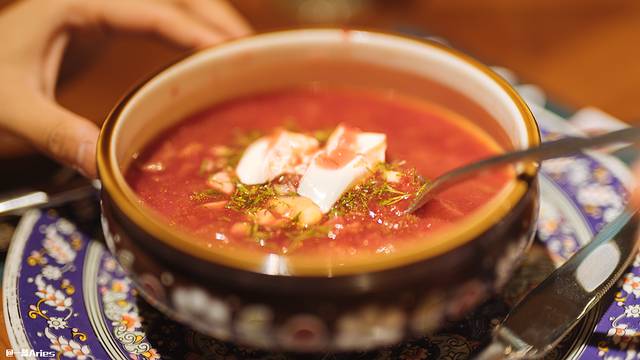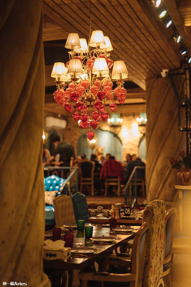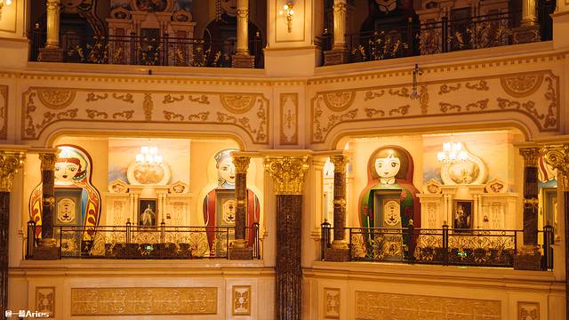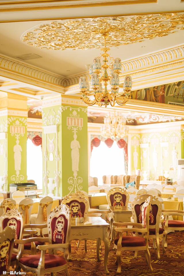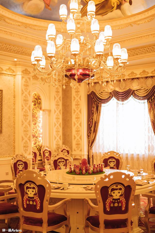 大厅里,长条餐桌整齐摆放着俄罗斯风格的茶杯、烛台、纸巾盒、糖果巧克力等;墙上则挂着精美的地毯、套娃等摆件。
