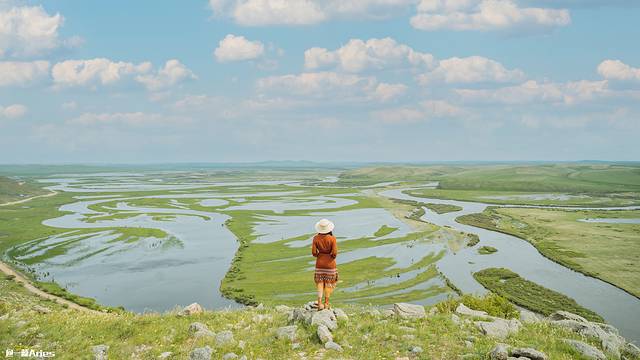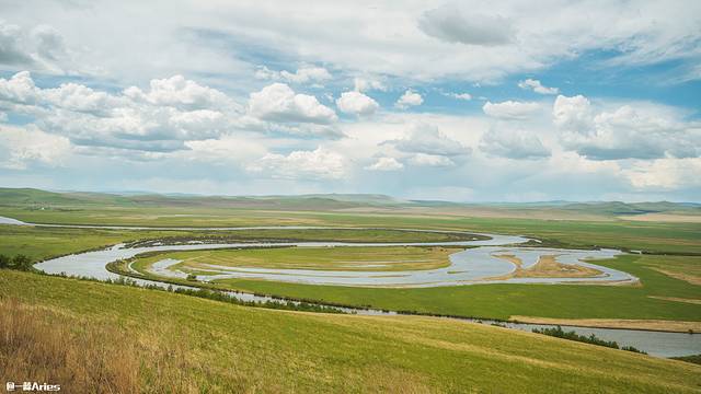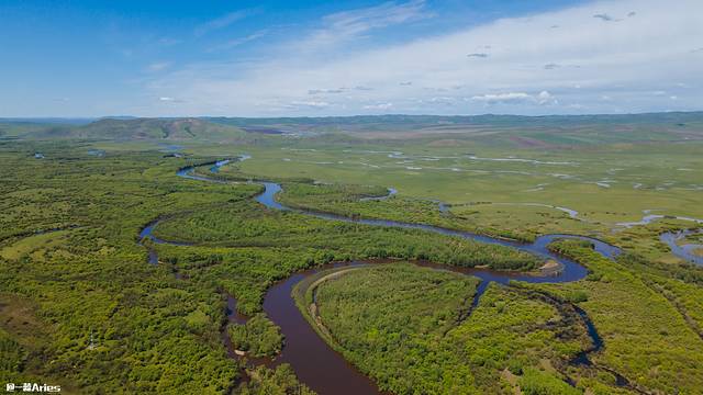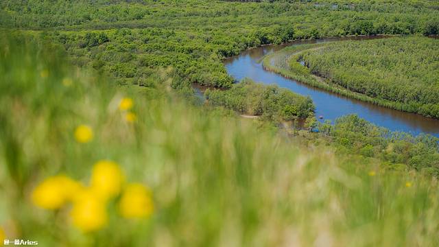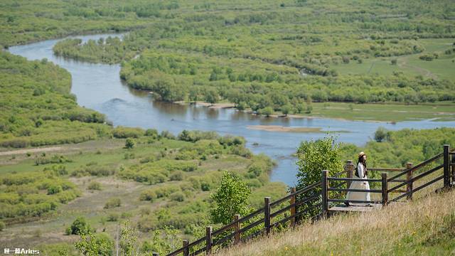 登上景区最高点,俯瞰气势磅礴的根河蜿蜒流淌,绸缎般的河水在绿草茵茵间,形成了平缓开阔的河流湿地景观。