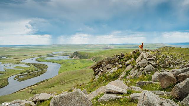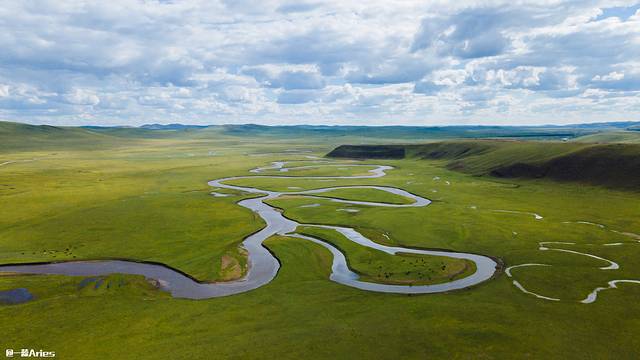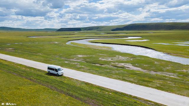 车行一路,天空之下是极致的辽阔,远方一条曲折蜿蜒的河流,像是一条洁白的飘带,落在辽阔无垠的草原上;这千回百转的就是著名的莫日格勒河。