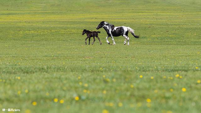 一只小马由妈妈带着,在草原上撒欢儿似得跑起来!第一次发现长长的鬃毛在风中舞动的姿态是这么飒爽。