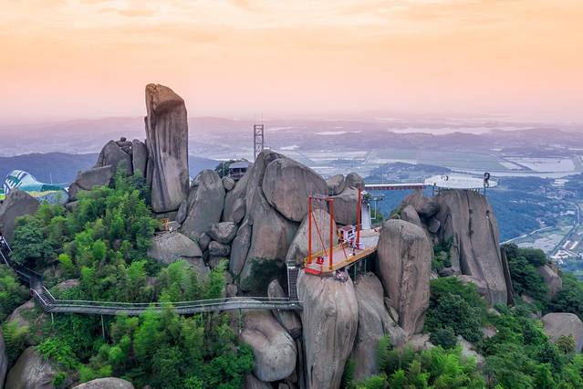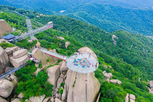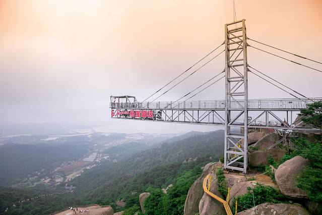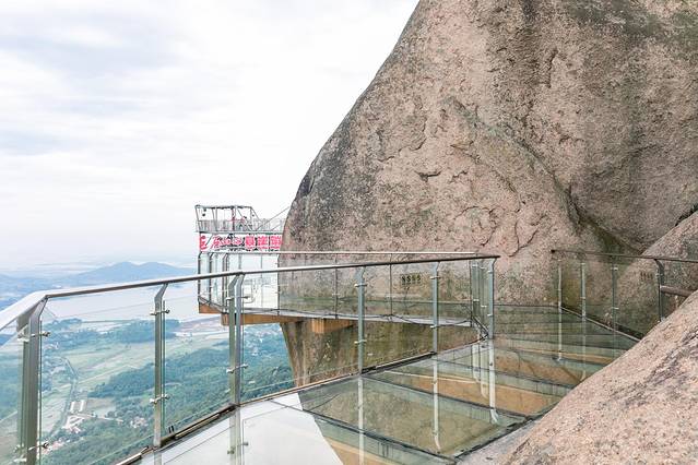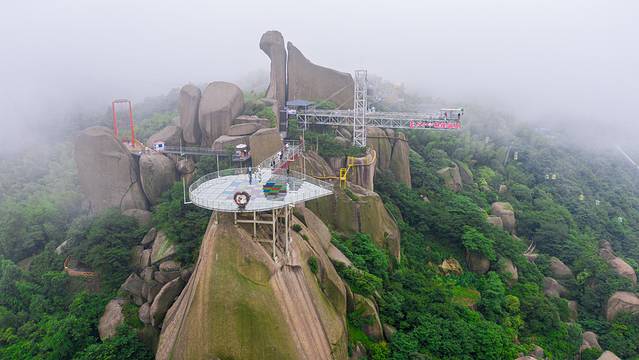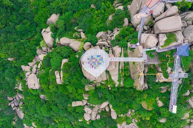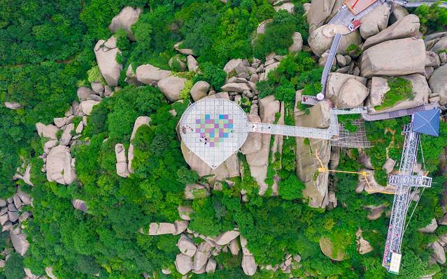 坐缆车16分钟到达山顶,顺着山路向上走,我们首先去体验一下心形玻璃观景台。520米海拔高度、520米栈道长度、520平心形平台、520度天空绝景。超高空云上“心形”玻璃平台,情侣酷爱的“海洋之心”,巨石山爆火的—— 520心形玻璃观景台。