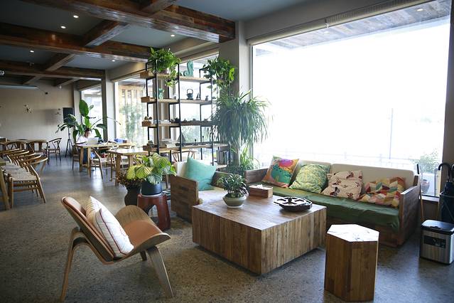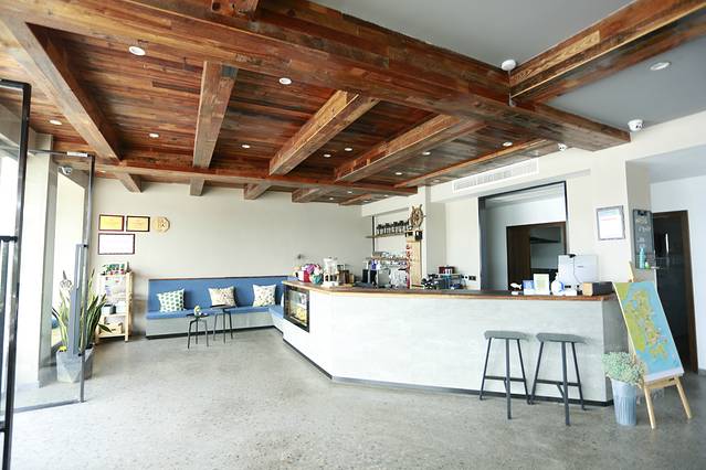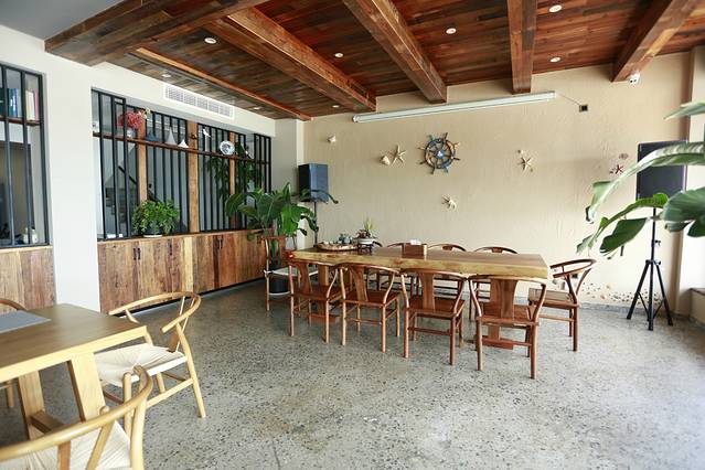 步入潮烟里的一楼,这里是潮烟里的公共区域,宽敞的空间,靠海一侧的落地窗设计,光线在这样的空间里会随着不同天气变化,时而明艳,时而柔和,下午时分的阳光照射进一楼大堂,透过窗户、桌椅留下的光影无比的动人。