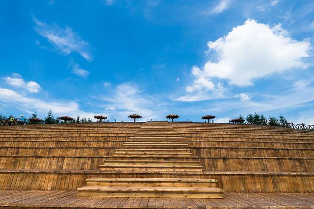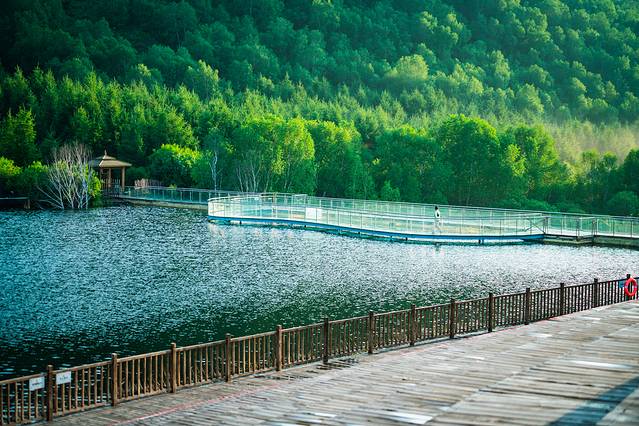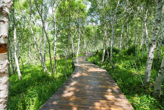 沿着木栈道,边走边看,走一段心路,看一程风景无限。七彩森林怎么能少了被誉为“纯情树”白桦林?景区里的白桦树多而密集,那一排排的白桦树婀娜多姿,笔挺的枝干仿佛深入天空。透过阳光,仰望树顶和蓝天,透彻醉人的是蓝,交相辉映的阳光与白桦。