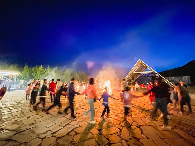 夜幕降临时,七彩森林国际度假酒店旁边的篝火晚会开始了。在篝火的烘托下,人们欢快地唱歌、起舞、相互祝福、传递快乐。无论男女老幼,大家围绕着篝火载歌载舞,在火焰的映照下,大家都变成快乐的孩子。