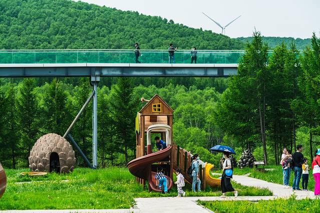 小火车停靠的终点位于丛林部落旁,这里有三条路可以选择,向左走是云亭,向右走是“树梢上的脚步”空中玻璃走廊和上下山木栈道,直接向前走可以骑马体验,穿越无人区,与网红鸟巢合影拍照。每条路都有不同的风景,每条路都通往不同的心情。