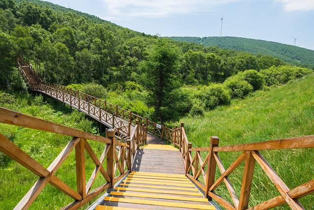游七彩森林有两条路,一是从景区门口沿木栈道徒步上山,坐小火车下山,另一种反之。这也是我的选择。在景区门口,坐小火车上山。与小火车轰鸣相伴的是欢歌笑语,花香袅袅,鸟鸣啾啾。从眼前掠过的是风,是蓝天白云,是绿水青山。远处山脊上的风力发电车一圈圈地转动着,转出一首夏日的歌谣,转出了夏日的美好生活。