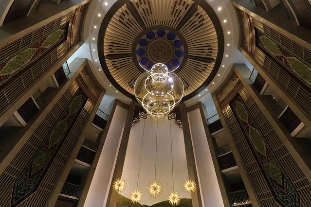 行宫穹顶形似夏朝冠(清朝皇帝的帽子),建筑高34米,并没有影响天际线,整体外形近看宏伟、远看隐秘,酷似皇袍肩部,喻意担负使命、拥抱四方;外墙面祥云和图腾,体现出吉祥美满的民族特性;景观绿化采用木、石、水、土四大元素,彰显生态、自然、灵性、力量;广场铸铜的八匹马喜迎八方来客,与叠水相映成趣、刚柔并济,预示着不待扬鞭自奋蹄的河北旅游投在省委省政府的正确领导下,凝心聚力、开拓进取,扛起河北旅游的大旗,开启坝上草原旅游新征程。