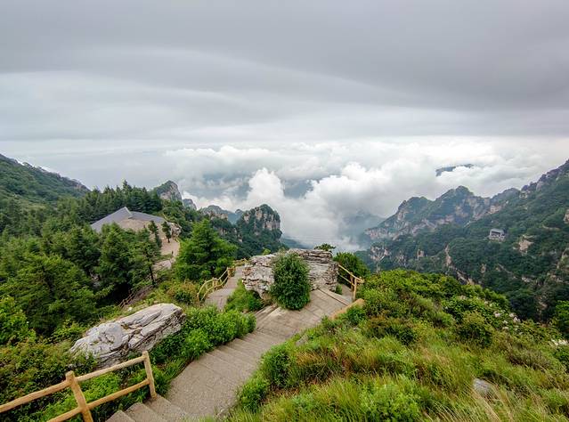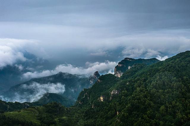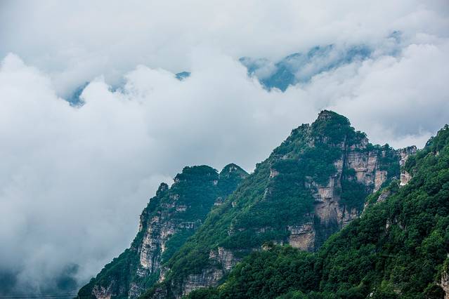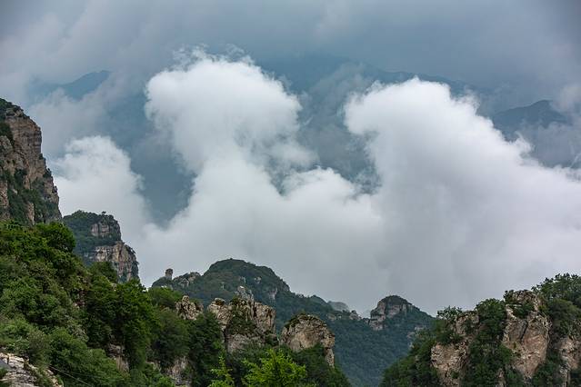 傲居八百里太行山最北端,,峰林苍翠波澜壮阔,未待雨后初霁,山峦叠影云海翻涌,震人心魄。峰云在雾霭中交织,林叶在亿万年隆起的大地上繁茂,阵阵花香随风扑面而来,绝壁栈道宛若逍遥天宫。