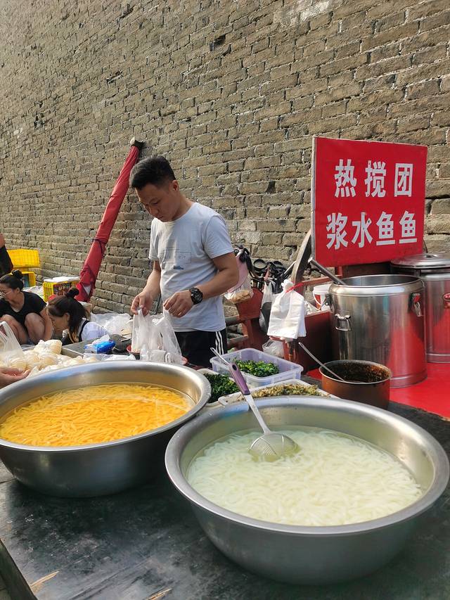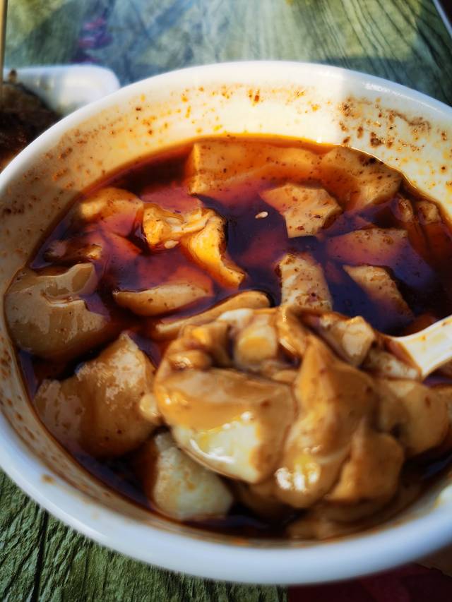艰难地往前走了几步,一个大叔端着一碗凉粉,坐在小矮桌上就开吃,顺顺滑滑的凉粉,掰碎的馍,一切为二的皮蛋,芝麻酱,辣子,满满一碗黑暗料理。我掏出手机问:可以拍个照片吗?大叔咧嘴一笑:你拍!好吃着呢!我要了一碗没有馍的,果然非常好吃!可惜太实在的一大碗了,没能吃完。卤汁凉粉,必须要留下名字。