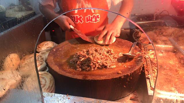 子午路张记肉夹馍,必须要特写。当地人推荐,什么时候路过都是满满的人。夹馍可以选择精肉、优质、普通,精肉瘦一下,普通和优质都肥瘦相间,优质的肉多一些。试了一下优质,怎么说呢,两个字:强推!馍和我们平时吃的不太一样,没有那么硬,肉夹得厚厚的,吃到三分之一的时候,油已经浸透了包裹的那张纸,到后来,塑料袋里都可见一汪油。很是罪过。