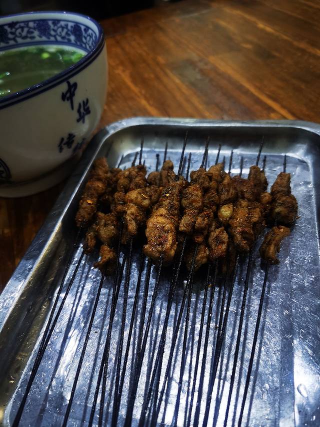 烤肉,其实就是我们说的烤串儿,当地人点菜的时候说,“多来点儿”“少来点儿”,老板会估摸着上,上来说我要十串二十的,必不是西安人。嗯,点了十串烤肥瘦,十串烤腰子。