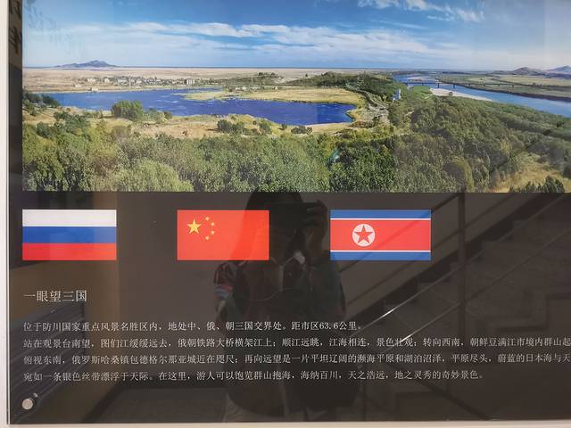 瞭望塔也称望海阁,登上望海阁11层,从望远镜(一元一次,一次一分钟,投币式的,有自动兑换机)里可以清晰的看到右侧是朝鲜的豆满江市,左侧是俄罗斯的包得哥尔那亚小镇。朝鲜那边可以看到有人在种地,俄罗斯方面比较冷清,没看到人。