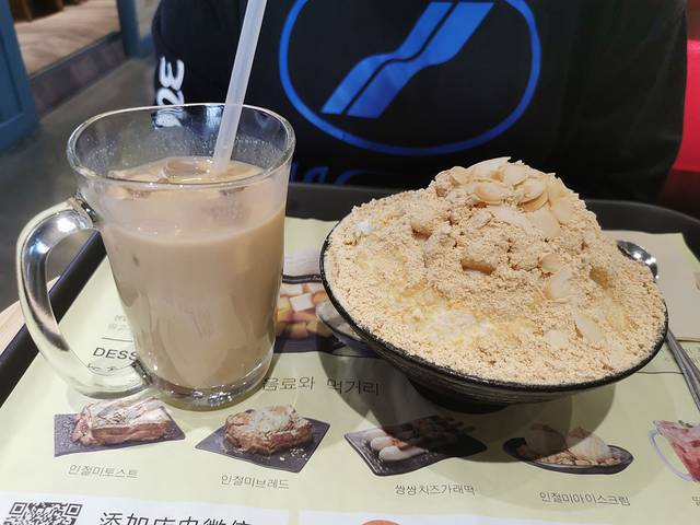从公园西侧出来有一家公寓楼,上电梯三楼有一家雪冰咖啡,店面干净雅致又温馨,她家的打糕雪冰味道很特别,冰冰沙沙的,还有豆粉和小的打糕块在里面,丝丝甜甜的很有特色,在大众点评上可以团购,价格有优惠。