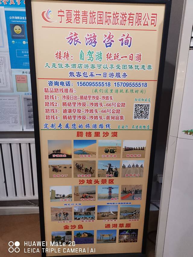 第二天建议早起点去沙漠,酒店有纯玩一日游的团,有4条路线 大家可以参考。我们是早上去公交站准备坐公交去的,现实是公交很少,在公交站碰见出租车拼座包车的,一个车是100块,是一天的行程。包括通湖草原-腾格里沙漠-沙坡头,我们2个人跟别人拼的就很划算了,2个人一天的路费60块钱。既方便又划算,建议大家拼车或包车,比较节省时间。