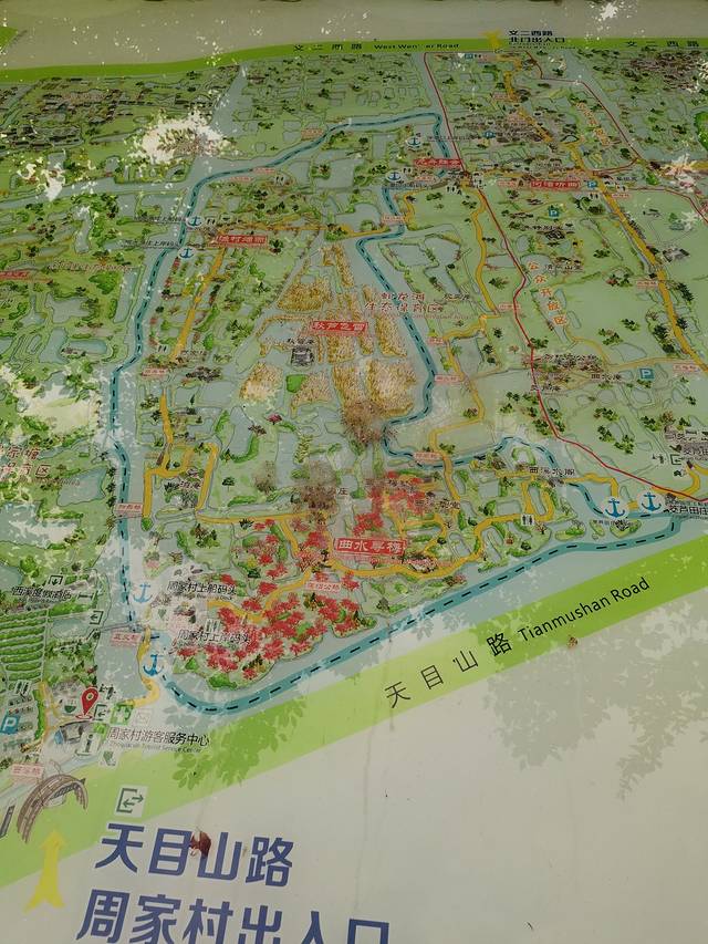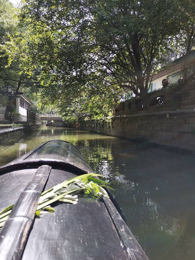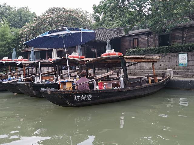 早晨吃了油条、豆腐脑…简单的早餐出发去“三西”之一西溪湿地公园。步行4分钟到达井亭桥站,乘49路到天目山路紫荆花路口。同站换乘356路到西溪湿地周家村站,下车步行6分钟左右到达西溪湿地公园周家村入口。在去哪儿网订了门票+船票,刷身份证入园。沿小路走到周家村码头。(周家村—烟水渔庄—深潭口—茭芦田庄四个码头从哪起到哪终。)刷身份证上船,到达的较早享受了一下包船一导游一驾驶员载着我和老公来到烟水渔庄。这里有三个展馆西溪人家,西溪婚俗馆,桑蚕丝绸故事馆。在桑蚕丝绸馆看到真丝丝巾买了一条129元,后来与凯喜雅比较还算便宜。碰到了一对拍婚纱照的新人,一个团队为其服务现在人真幸福😁。逛完再到烟水渔庄码头乘船到深潭口。这里有拍摄《非诚勿扰》的场景。西溪且留下的题字,小桥流水人家。一群身着汉服的姑娘在水边翩翩起舞在拍视频,时不时的蹭听一些导游的讲解,听着南腔北调的语言…从深潭口检票口出去是西溪湿地免费区,一条步行商业街逛一圈。返回深潭口码头这时游客渐多,站排上船去茭芦田庄。游高庄后没有返回茭芦田庄坐船继续前行到西溪湿地博物馆从西溪天堂出口出来坐49路返回。在高德地图上搜美食,搜到银泰三楼白鹿餐厅,团的二人套餐。蛋黄烤翅,石锅饭,酸菜鱼,菌菇芦笋和两杯饮品。味道很好,顾客很多。