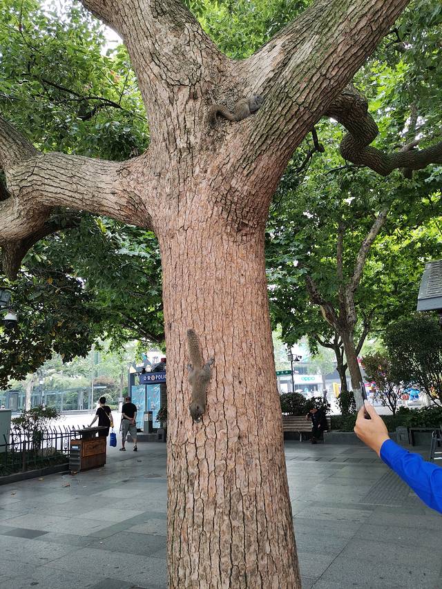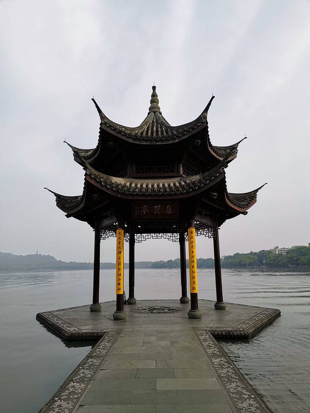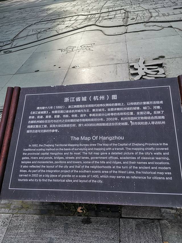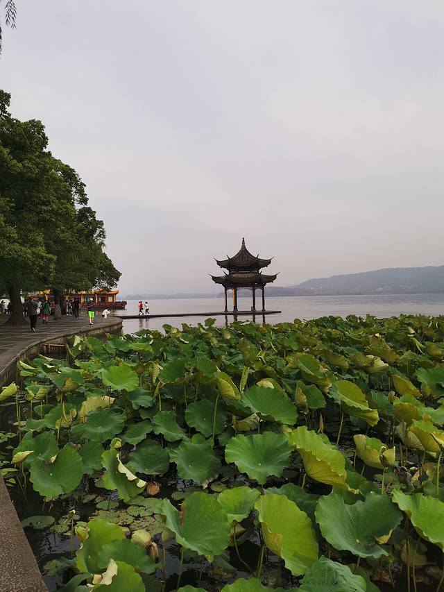 早晨,天气有些阴雾茫茫的体感不太热,步行出发去西湖,到达邮电路南西湖边1:400比例在地面上刻制《浙江省城图》。沿环湖绿道步行沿路有音乐喷泉(夜间有表演),松鼠投喂区,松鼠很多经常有人喂食。走到孤山路进入断桥白堤,断桥得名于大雪过后南北桥面雪融速度不一而出现似“断”的景象。白堤是为了纪念白居易而得名。