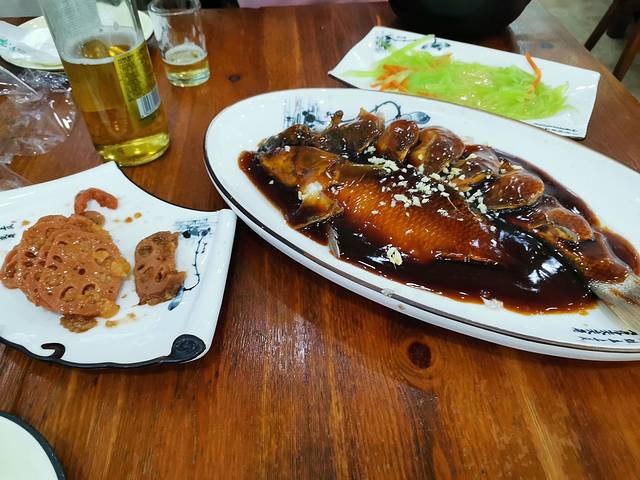 沿夜市找到一家杭帮菜馆,点了西湖醋鱼、糯米藕、炒笋丝。杭州的菜偏甜,很清淡,鱼很新鲜。