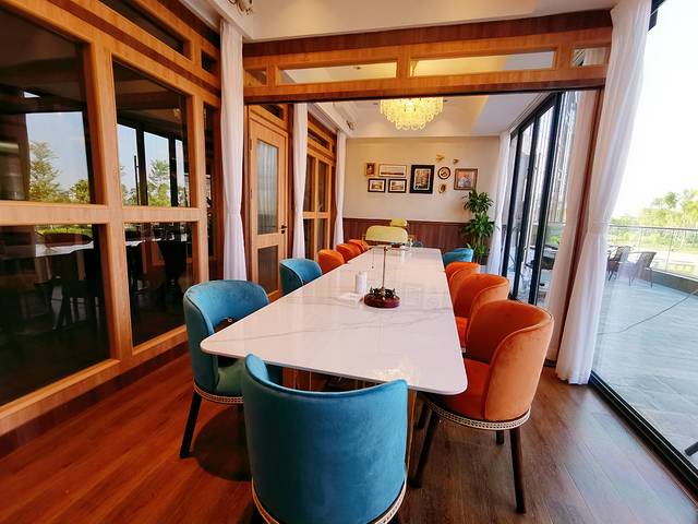 有一个玻璃屋西餐厅,坐在座位上吃饭还可以晒晒太阳,如果是雨天,可以聆听雨水拍在玻璃顶上发出的啪嗒啪嗒声,如果是星光璀璨、月光柔和的夜晚,还可以边吃饭边赏夜,店铺内饰很适合拍照打卡。