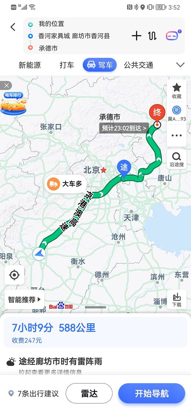 导航显示到承德五百二十多公里,需要六个半小时,我们早上九点五分才上高速,就计划着中午赶到香河去吃鼎鼎大名的香河肉饼,还可以随便看看那里家具城红木家具。
