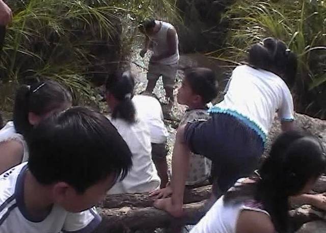 远处的山上,山壁有个进来时就看到的流水瀑布,炎热中,瀑布很有诱惑力,小朋友更是助长声势嚷着要去。那就去找瀑布,走小路,穿草丛。一拨人未到瀑布前,便寻到了溪流,大热的天时遇着水,不用分咐,孩子们一下子都卷起裤腿淌进溪水去了,只是不能尽了个兴,正在起劲洗脸泡脚凉快,还思忖要不要让小的们直接扑入水里时,勿见山顶上,滚滚乌云从另一边毫不留情地涌上来,立马惊慌无失措地高喊,全体撤退,不是怕被那场瞬时而降的雨全部淋湿,而是很明白一场大雨后可能引发的山洪。