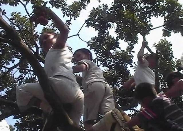 当满树果实低到在你身边到处都是,张口就能吃到的时候,小朋友的兴趣已经不在摘果了,最大的乐趣是爬树,爬树这门课没学过也没教过,但却个个表现出色,虽然个个都满身满头大汗。这天很多小孩穿了白衫白裤去爬树,不知该打谁的屁股?
