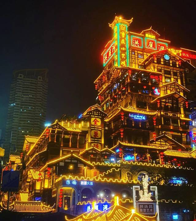洪崖洞民俗风貌区想必早已是个大社交平台的大网红了,被誉为“现实版的千里千寻”,华灯初上,车水马龙,热闹非凡。
