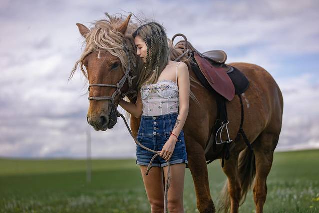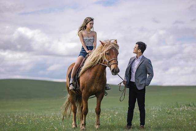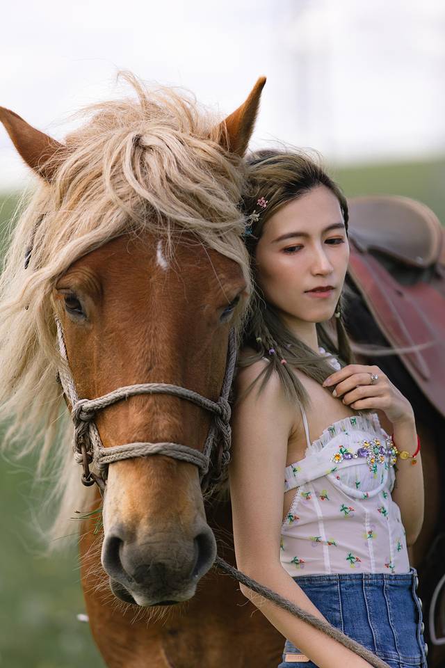 脱去纱裙和头纱这样就能和马儿更近距离的亲密接触拉!