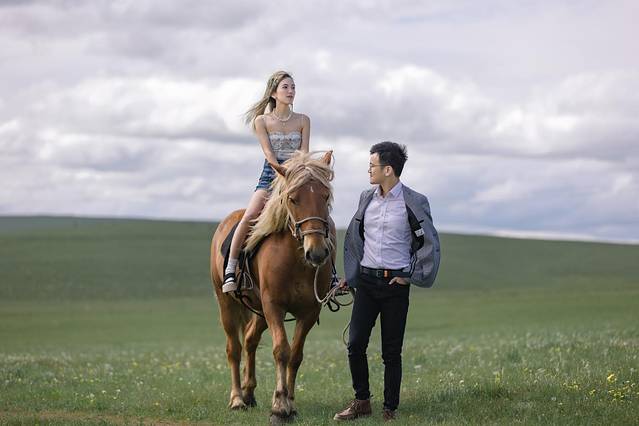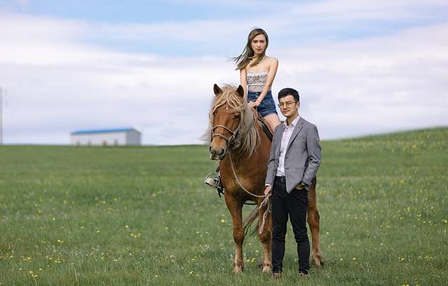 轮到小齐出场了,这是我和衣刀在草原上的第一张合影。小齐在一旁忍不住大喊:“新娘和新郎相互对看下!” 哈哈哈,我忍不住笑出猪叫声,小齐这带入感也太强了吧!你们放大看,明明说好的深情对望!你们看看衣刀在干嘛!我望着他,他闭眼望着我!深情个毛线呐~哈哈哈哈