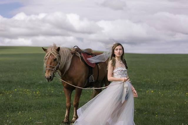 大哥帮我牵了一头漂亮的马儿过来让我拍照,告诉我要站在马的左边,这样马不会惊慌,也不要站在马的身后。因为我穿戴的都是会飘的纱,马会害怕,所以上马前一定要先脱去。
