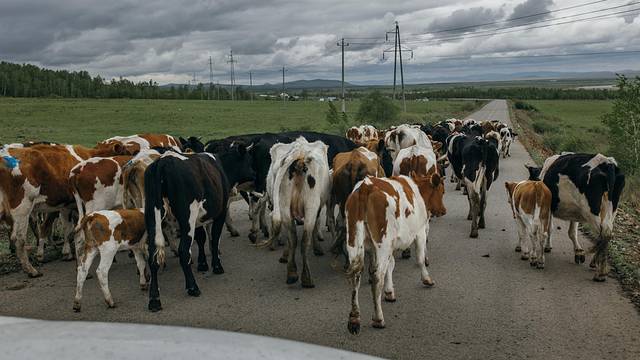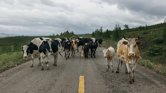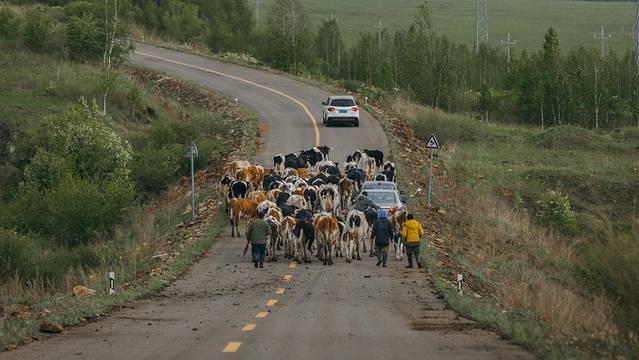 偶遇一大群牛儿们,远看在我们前面的车子已经被牛儿包围住了。我们慢慢的跟在牛儿们后面。
