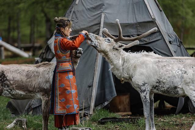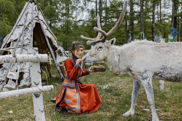 在古老的部落亲密接触驯鹿。