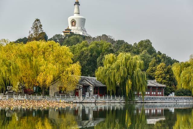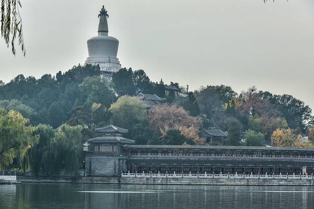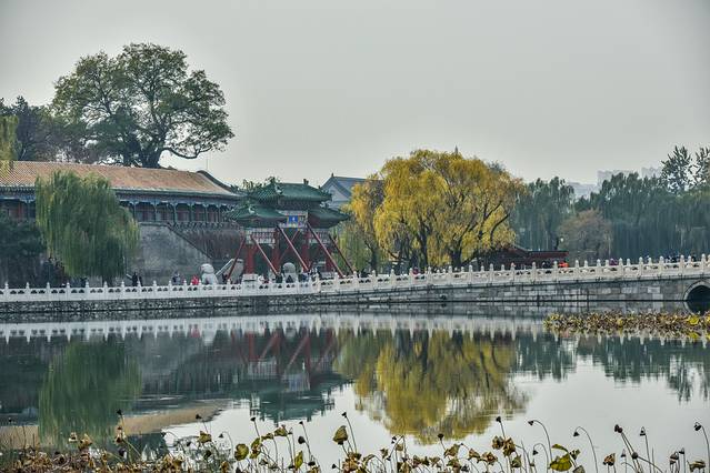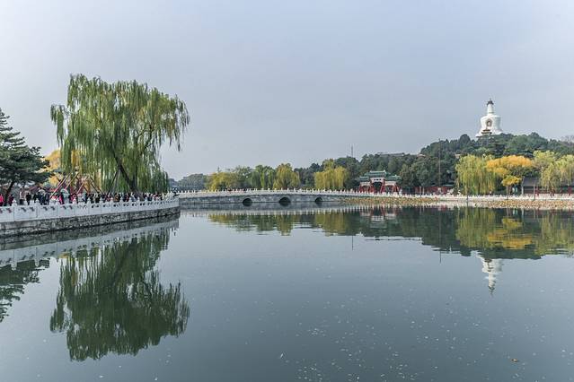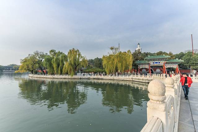 从通往琼岛的石桥上能够清晰的看到四周全部是湖面,深秋的湖水与翠柳为京城御花园的美增添了浓厚的笔墨,这种风光实在是太赞了,你们喜欢不啦?