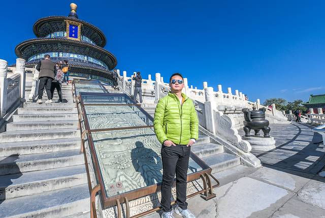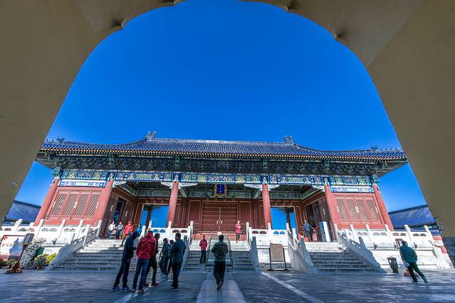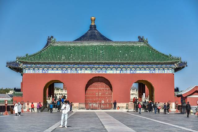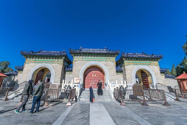祈年殿是天坛内最宏伟的建筑,其作用是向上天祈祷,是明、清两代帝王在这里三拜九叩祈福天地的神坛。看似很迷信的地方,其实是祖先们智慧的结晶,他们将天、地与人地球三要素之间的关系通过空间建筑结构来实现天人合一的目的。山野君所在的这个位置的建筑都是很有讲究的,这些设计与构造都彰显了古东方古国的智慧,有兴趣的不妨深入研究一下,山野君就不再赘述。