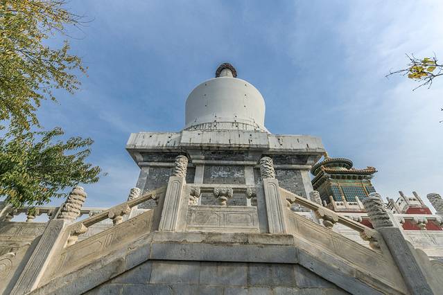 琼岛最高的建筑物便是白塔了,它是一座藏传佛塔,是公元1651年的清朝顺治八年建造的,整个塔高将近36米,堪称北海公园之巅。关于这座琼岛与白塔有很多典故可追寻,如有兴趣的话可以自行研究。