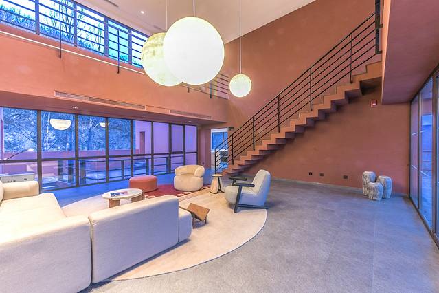 红房子室内设计很现代化,分为两层楼,楼下为公共区域的会客厅、观景阳台以及餐厅,楼上为4个主卧客房。三朋四友一起入住在这独栋别墅中别有一番趣味,或者是一大家子人入住也很适合。