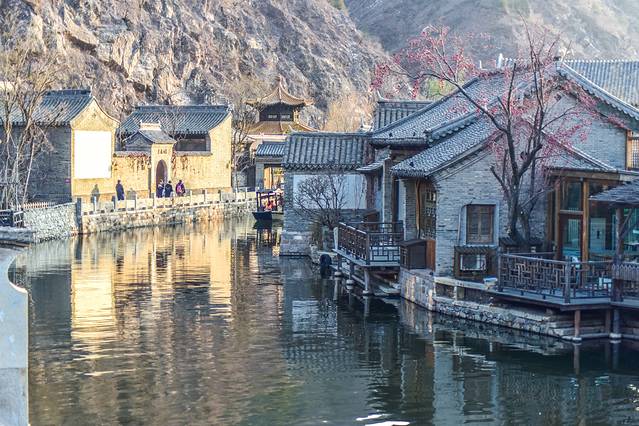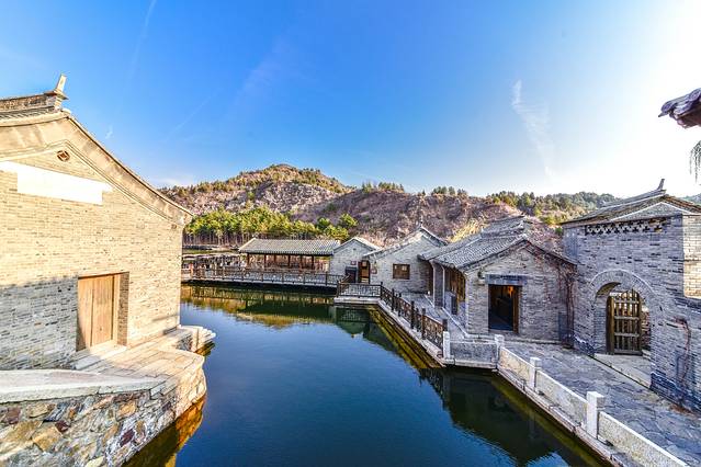 因为它是仿造乌镇的样子与格局,所以会有江南水乡的气息。唯一与江南水乡不同的便是它的气候,古北水镇的色温比江南低,在冷暖对比度极强的画面中即可领略到北方寒冷的冷色基调。这个季节的北京还是挺冷的,不过风光依旧很美。