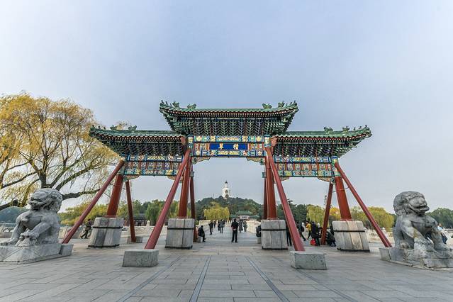 连接北海公公园南门牌坊与琼岛的石桥是元朝初年建造的永安桥,以"堆云"和"积翠"这两座彩绘牌坊为首尾标志。相传在明清时期该岛生长着一种名为琼花的观景植物而取名为琼华岛并简称为琼岛。