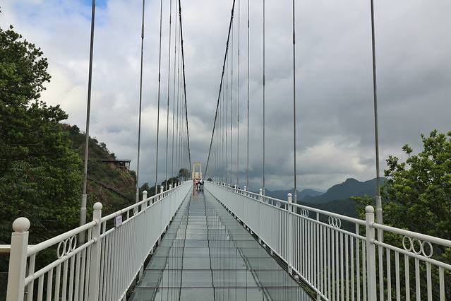 走上玻璃桥,全长330米,宽2.5米,高差198米,是目前江西最长的玻璃索桥。山间云雾缭绕,横跨两山的玻璃桥仿佛横架云端,恰似人间仙境。