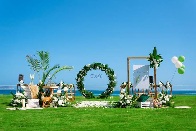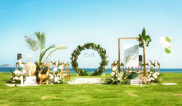 这块草坪的面积很大,一把是用来接待很大型的婚礼或者会议。大型户外烧烤餐饮等,酒店是不可能以我成交的价格租借给我的。所以我知道肯定是海边的一小块草坪,虽说是小草坪面积也达到了200-300平方米,足够用了。草坪婚礼的好处是:造景容易,配各种颜色的花材都非常搭配,新娘穿高跟鞋容易走路,宾客坐在草坪上很舒服。我这块草坪背靠大海景色非常漂亮。