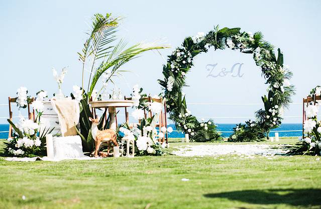 第三选婚庆公司。这个部分和旅游关系不大,所以就略写。我是通过关系找到的某夫人旗下的婚庆公司。当然现在做旅婚的公司很多,因为我们要的业务相对一般的旅婚还不大一样。因为我已经自己搞定了住宿场地餐饮这些环节,我只需要一个婚庆公司给我走一个流程,要一个靠谱的化妆师,一个优秀的主持人和优秀的摄影摄像团队,以及现场场地搭建等等。这部分下来价格也是不菲的。当然这也是需要大家根据个人的情况进行选择。某宝上也有几家很大的婚庆公司可以做这部分。婚庆公司最关键的就是所谓的四大金刚,主持化妆师摄影摄像师都是根据档期来的,我个人比较关注的就是婚礼场地造景,在这些细节上跟负责人谈了很多次。一般情况下除非各位仙女有自己特别执着喜欢的主色调。比如就喜欢橘色紫色等等,如果没有特别执着的色系最好听从专业人士的建议。我父母比较传统就喜欢红色。可是全红搭配绿色草坪的确非常怪异。我个人特别喜欢蓝色或者冷色系,但是负责人告诉我其实蓝色搭配沙滩婚礼比较好,搭配草坪并不是很出片。最后选择了全白色花朵,就是白——绿色系的婚礼主题。因为白色的花朵在自然界特别常见,4月也是好多白色花材丰富的季节,白玫瑰、白桔梗、白色紫罗兰等等。一般婚礼场地都是真假花搭配的,有些公司的假花和真花比例能达到8比2 。等于婚礼现场没有几朵是真的。我这次真假花的比例达到了6比4 。还算是非常良心的。