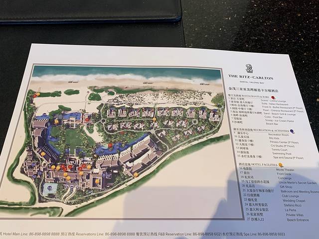 丽思卡尔顿酒店地图。客房部分真心大的不像话,我们家的宾客住在后面的高层里面。找个人都费劲,真的是太大了。别墅区人也不少,靠近中间的几栋都是满满的人。