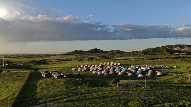 最吸引人的是一座座红色的、粉色的、黄色的、蓝色的,圆顶又富有童趣的小屋,如同一个个馒头,散落在美丽的汗苏鲁草原上,这些美丽的七彩的房子还有个可爱的名字——馒头屋。不用去日本九州的熊本县就可以体验同款馒头屋。