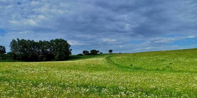 午餐后继续前行,从丰宁进入围场御道口、塞罕坝国家森林公园,进入内蒙,穿过乌兰布统大草原,再走上20公里的沙石路,就进入汗苏鲁国际生态牧场了。景区的路是原生态的砂石路,路两旁是一丛一丛的白桦树和漫山遍野的各色鲜花,手机随手一拍都是一幅风景油画,不过路上停车也要注意安全,也不要久留,因为这些美景到了正式的景区也都有,还有更多人文景观点缀,可以尽情创作。