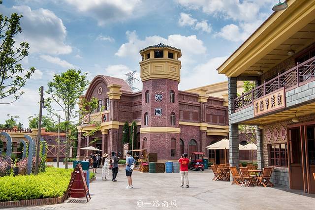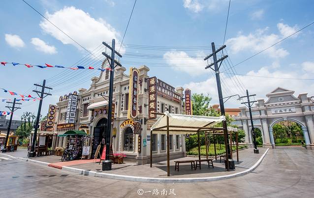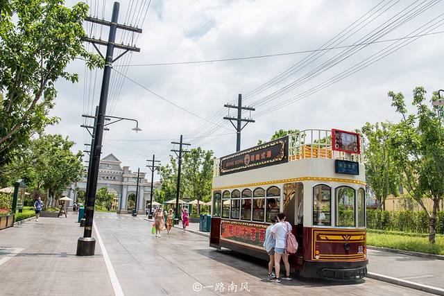 公园内建有上海街、香港街、北平街、瑞金街等历史街道,活力十足的双层观光巴士、充满卡通感的洋楼、年代风情浓郁的茶餐厅,以及各种主题餐厅、休闲景观和商店都让人产生穿越感,仿佛进入一个巨大的影视剧片场。