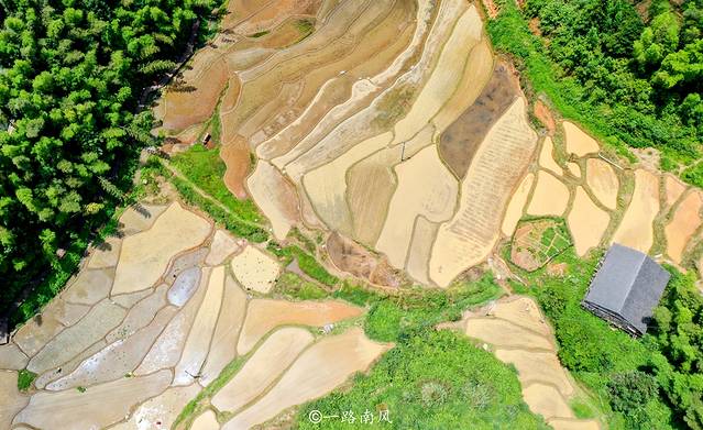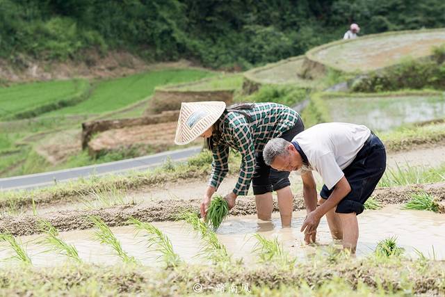 梯田层层叠叠,清风吹动秧苗起舞。稻田里,勤劳的农民背靠青天手插秧,一行行、一排排,就像绣花一样精细。