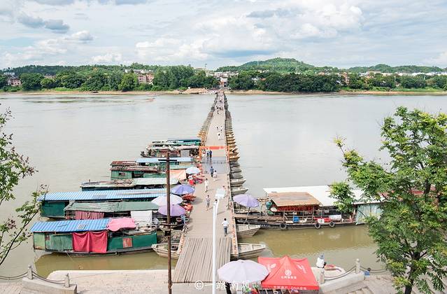 这座浮桥的长度大约四百米,从北宋建成至今已经八百多年,由缆绳将一百多只小舟板连接而成,是当时的伟大工程。
