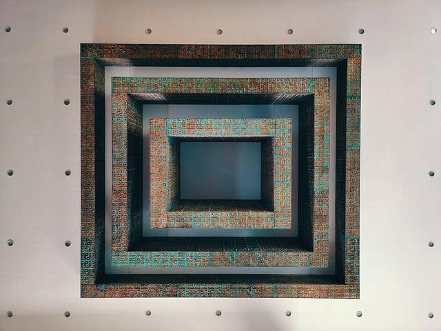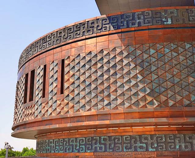 铜陵博物馆是国家二级博物馆,外观非常大气,是以春秋兽耳鸟纹鉴为原型而建造。志愿者告诉我圆形铜幕墙由近3千平方米的菱形青铜板拼装而成,用铜量高达50吨,是中国最大的单体装饰铜幕墙。这让我更加迫不及待地进入馆内,直奔参观了。