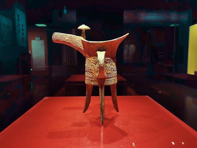 ▲镇馆之宝是饕餮纹爵-饕餮纹斝:斝是一种盛酒的器皿,也可以温酒,有扳有流,与爵常常组合在一起使用。
